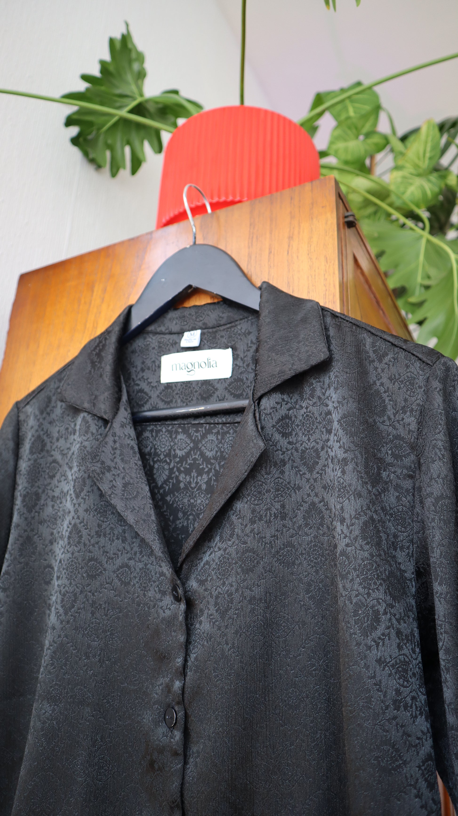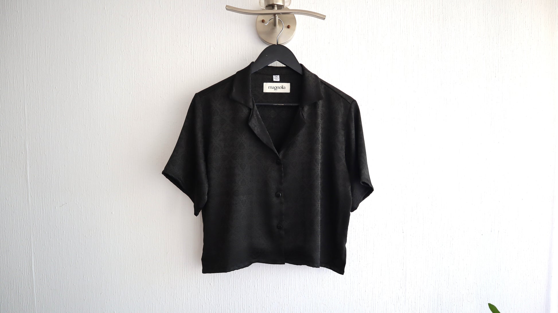 Blusa Berta hecha de satín con diseño de color negro. Tiene una caída muy ligera. Cuenta con bebedero y llega un poco más abajo de la cintura. Es calce oversize.