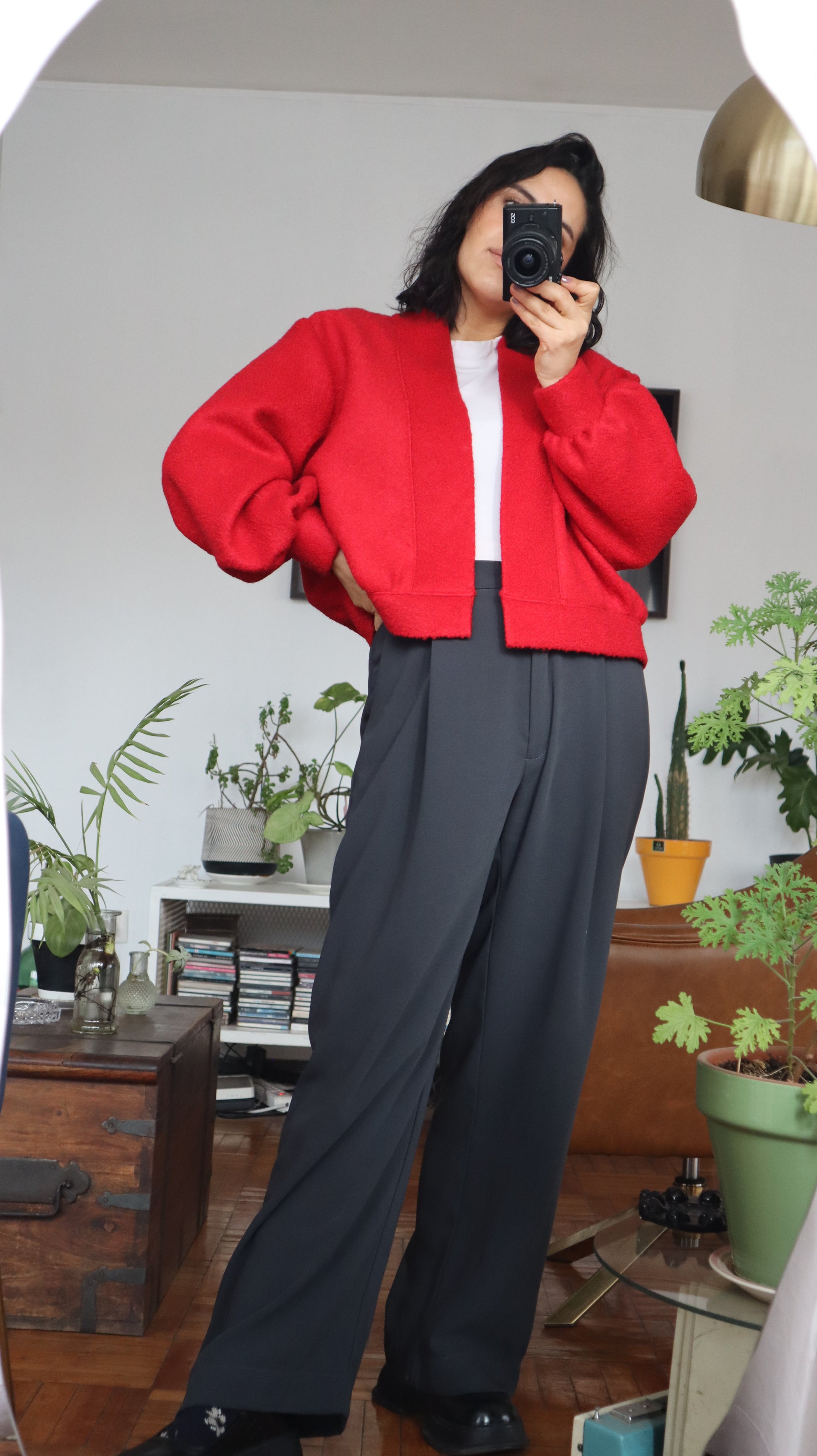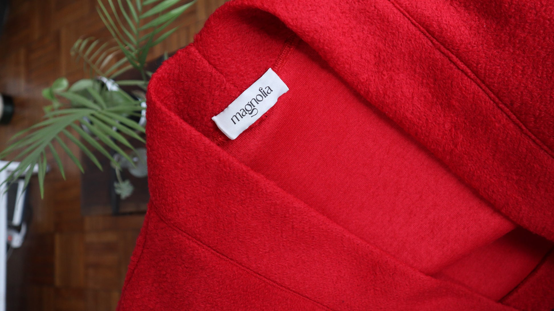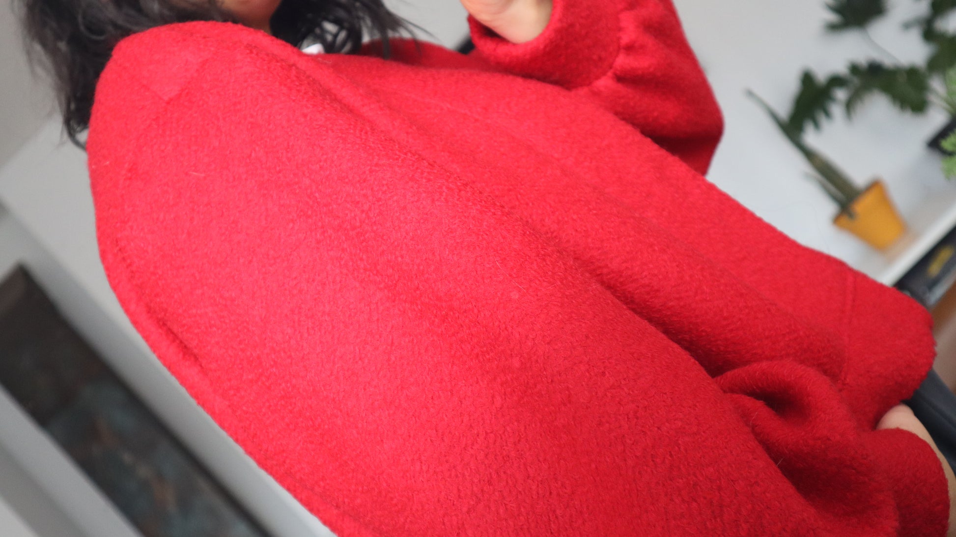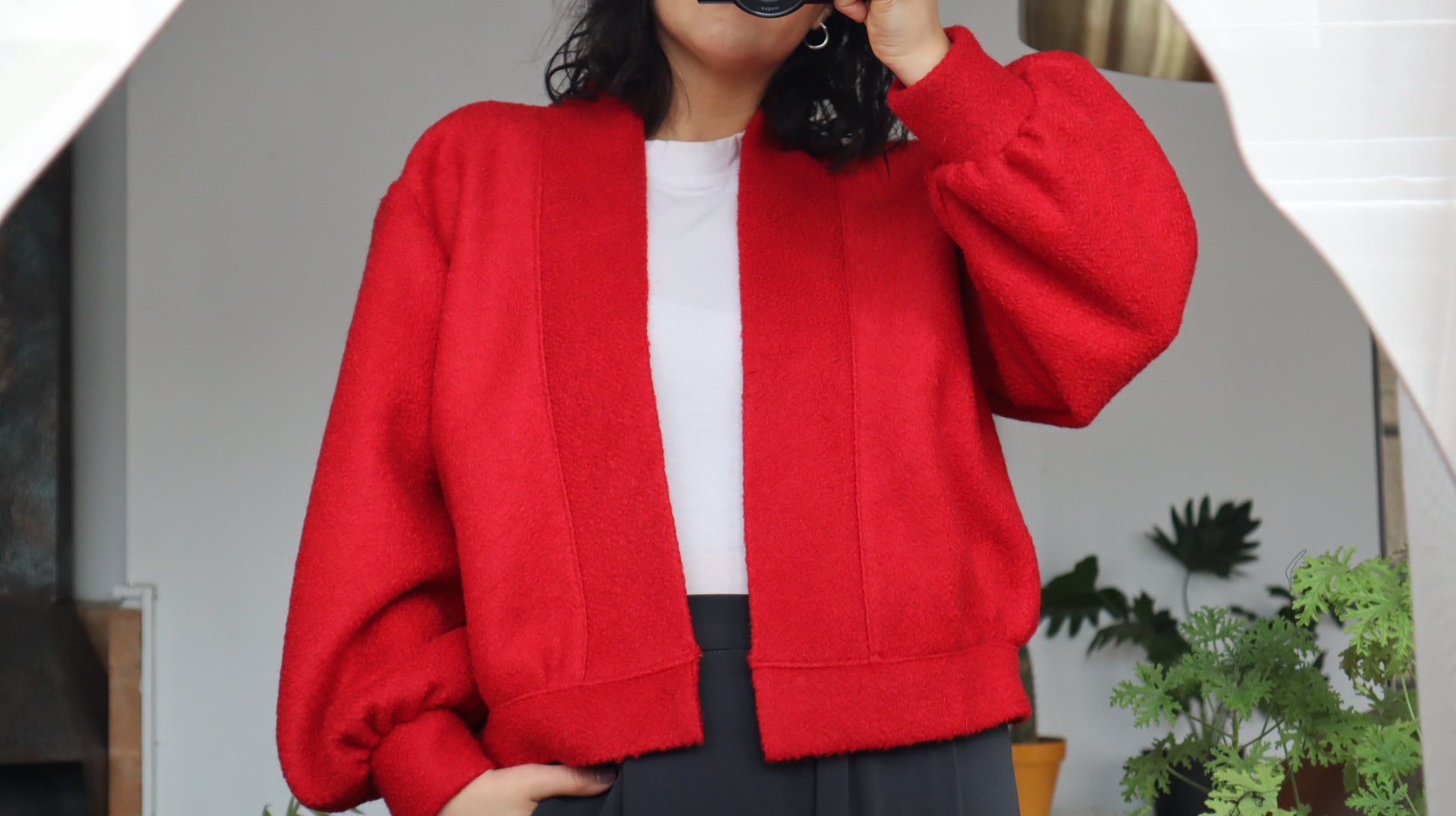 Chaleco rojo, con calce oversize y siza rebajada. Es abrigado y tiene un bajo porcentaje de poliéster. Tiene puño globo y pretina que también genera volumen. Cuenta con un cuello tipo kimono que hace que sea mas cómodo.
