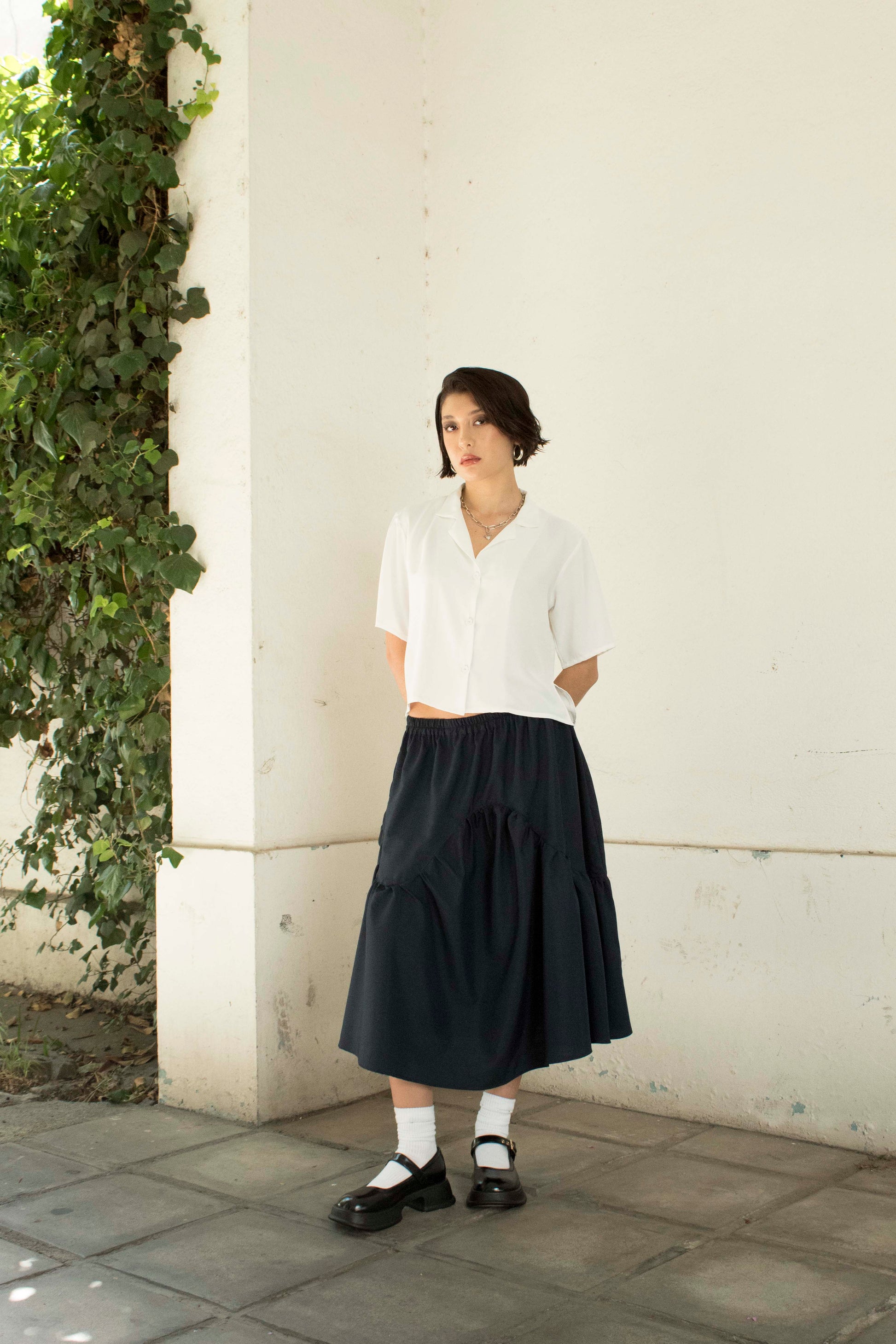 Falda irregular azul marino, hecha de algodón, es fresca. En su cintura cuenta con elástico para abordar mas tallas y es muy ligera para altas temperaturas