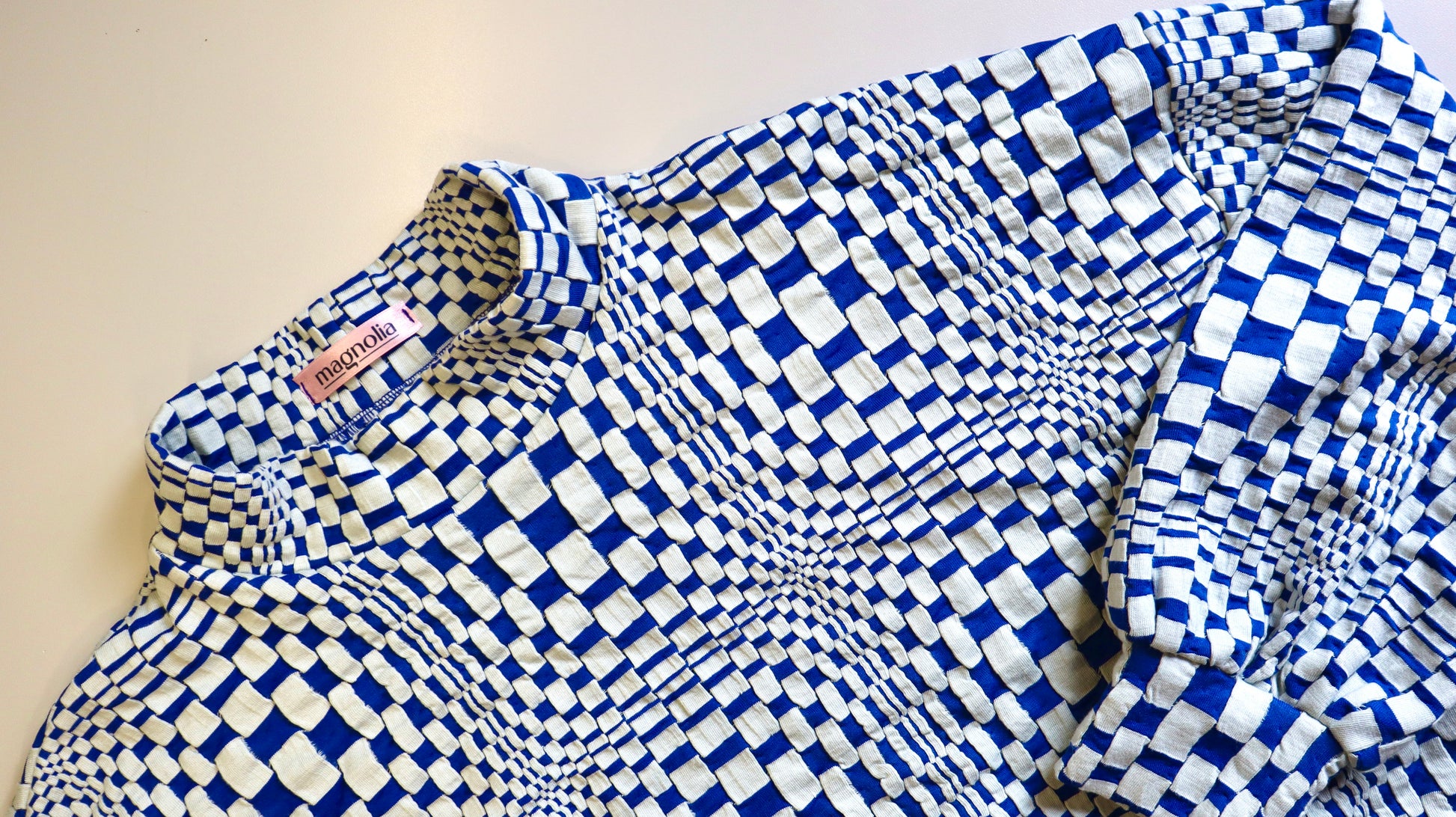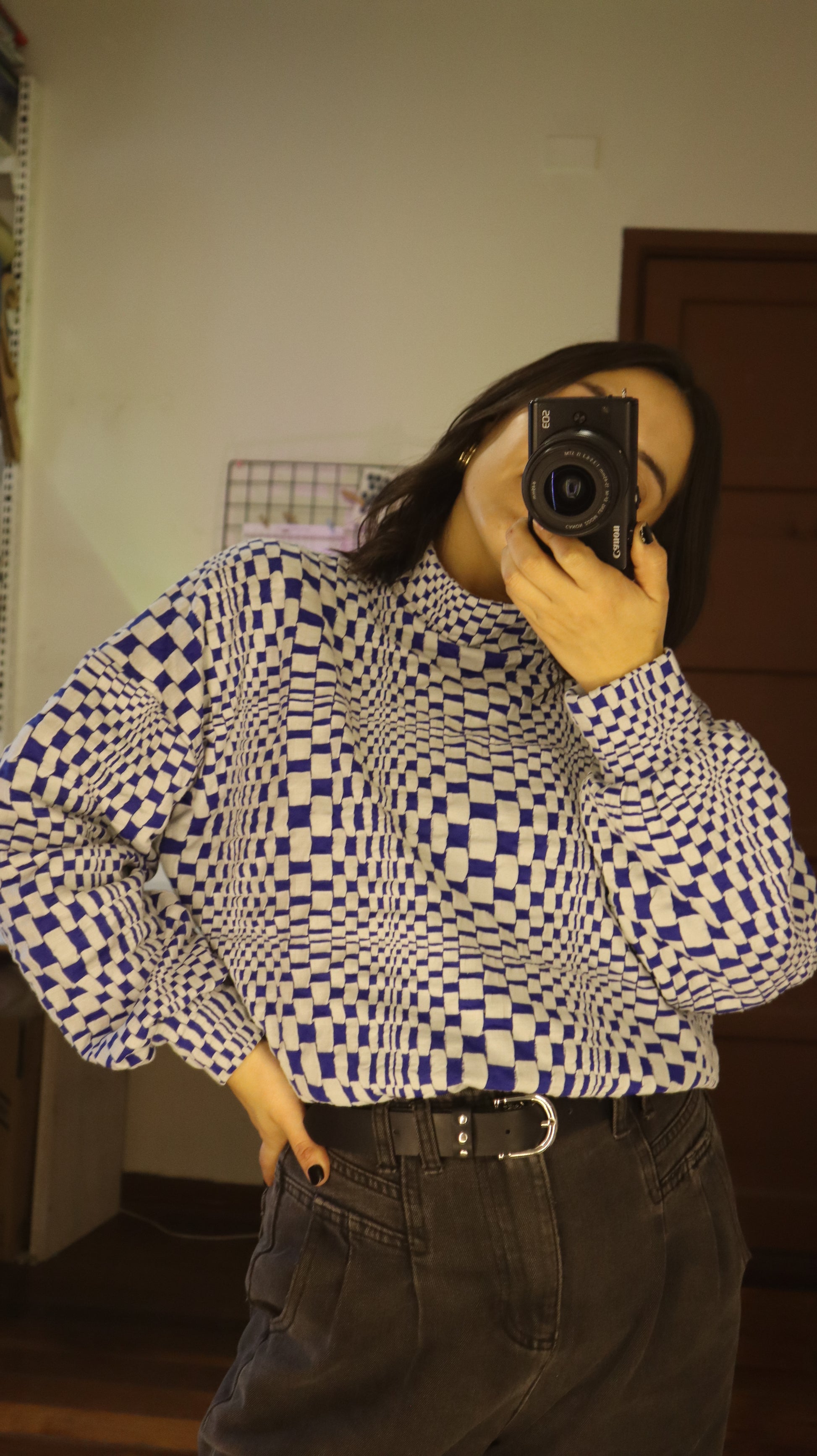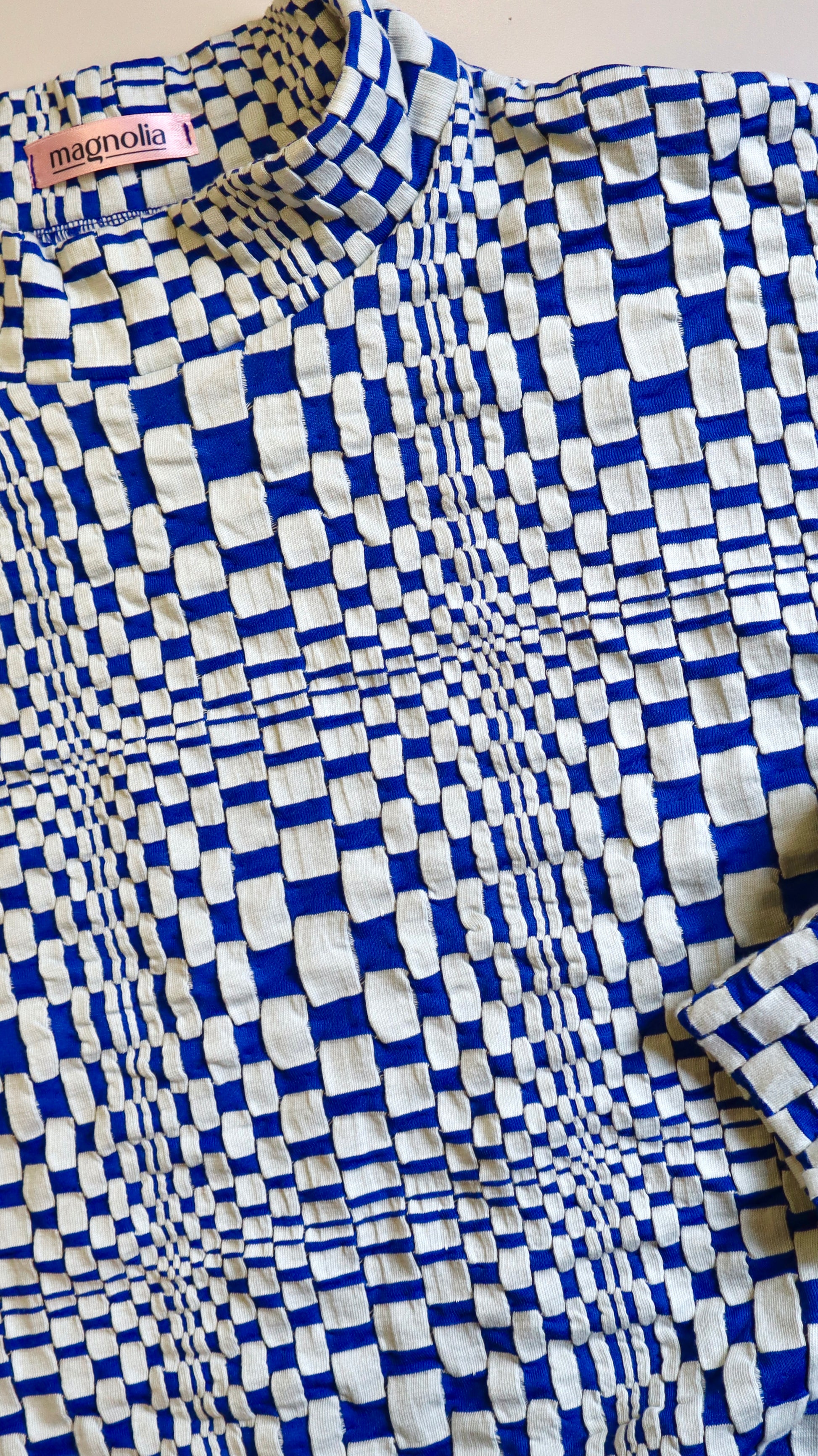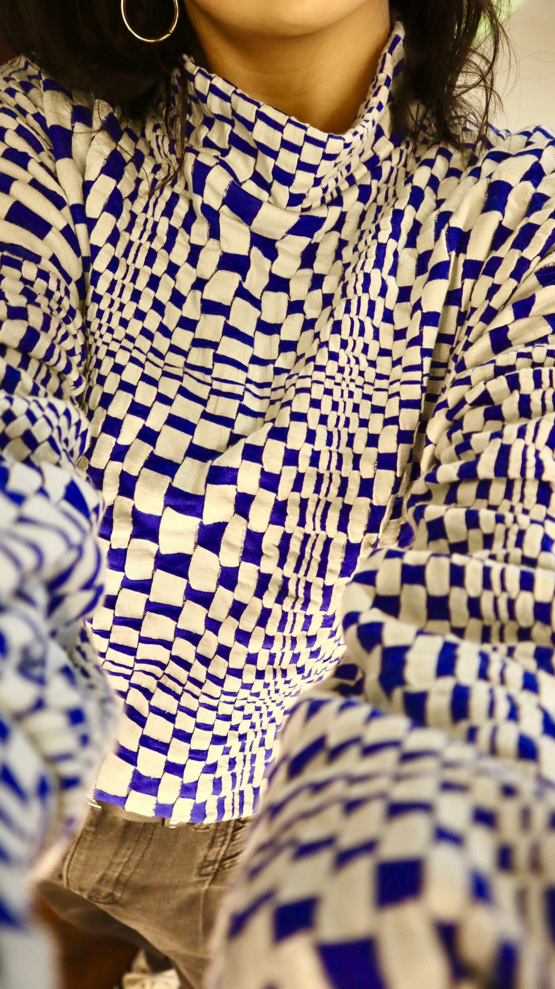 Poleron hecho de algodón con un diseño de cuadros que genera una ilusión óptica. Tiene cuello, puños y pretina para crear volumen en el cuerpo. Llega hasta arriba de la cadera, tiene un calce oversize pero más corto.
