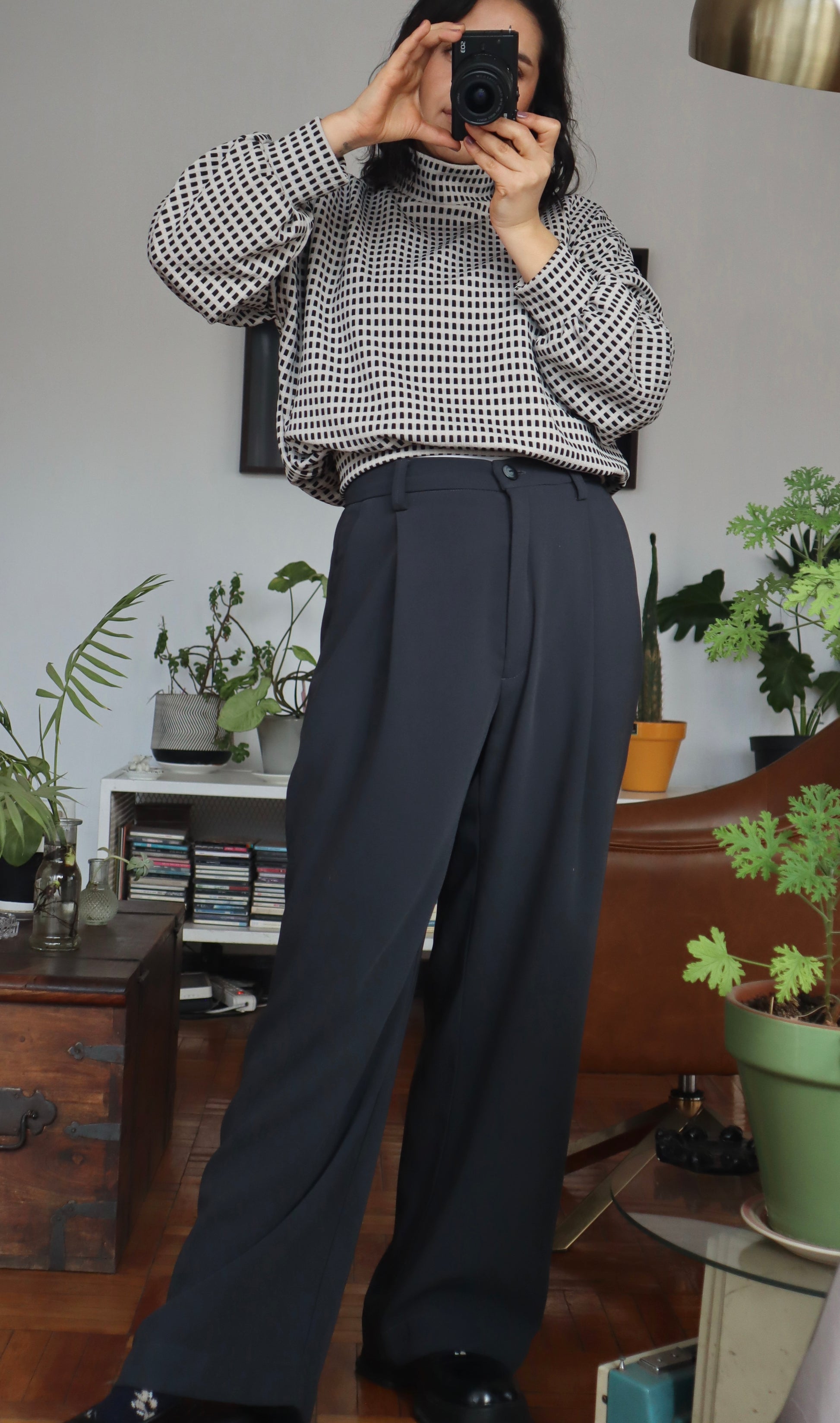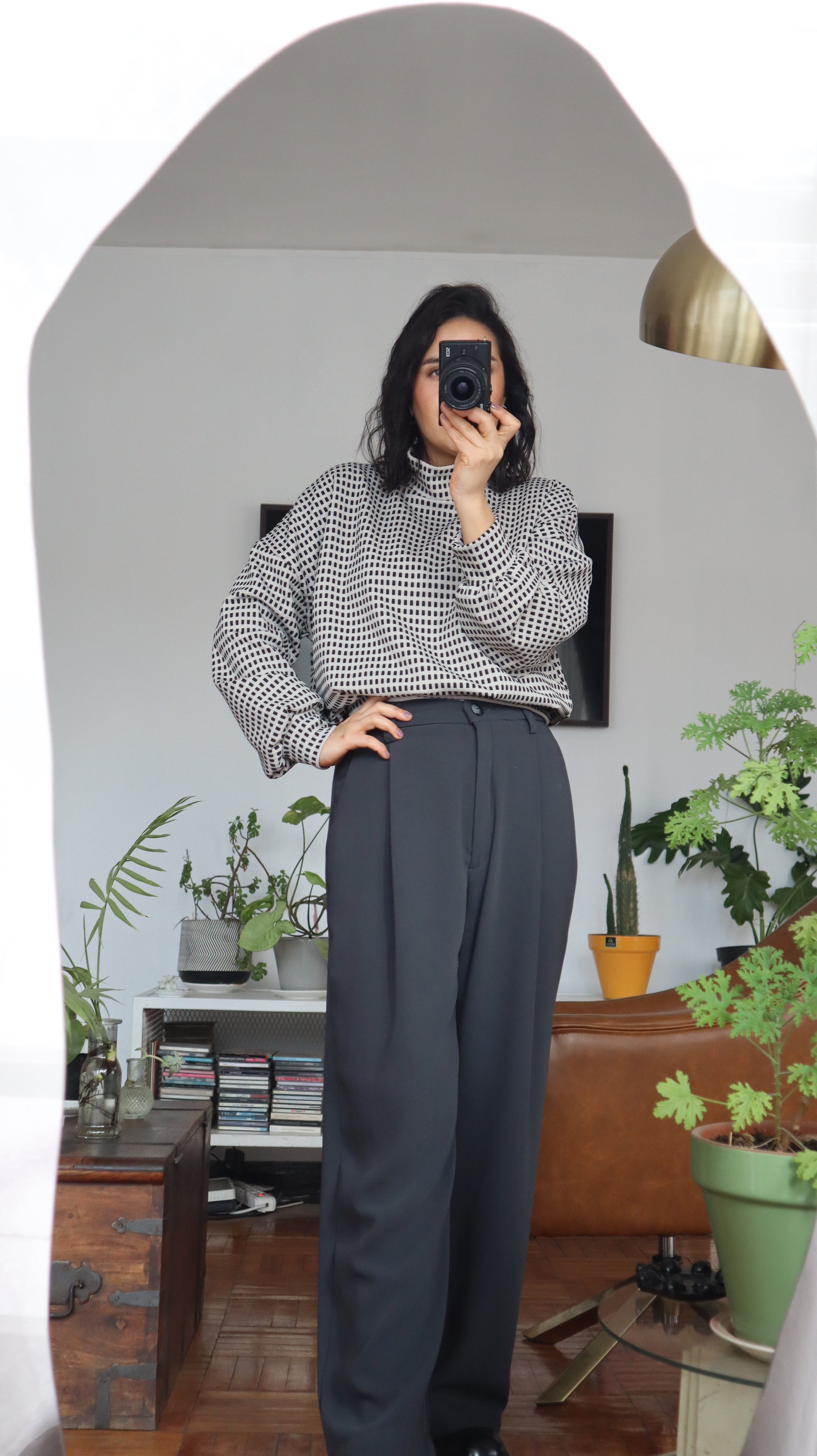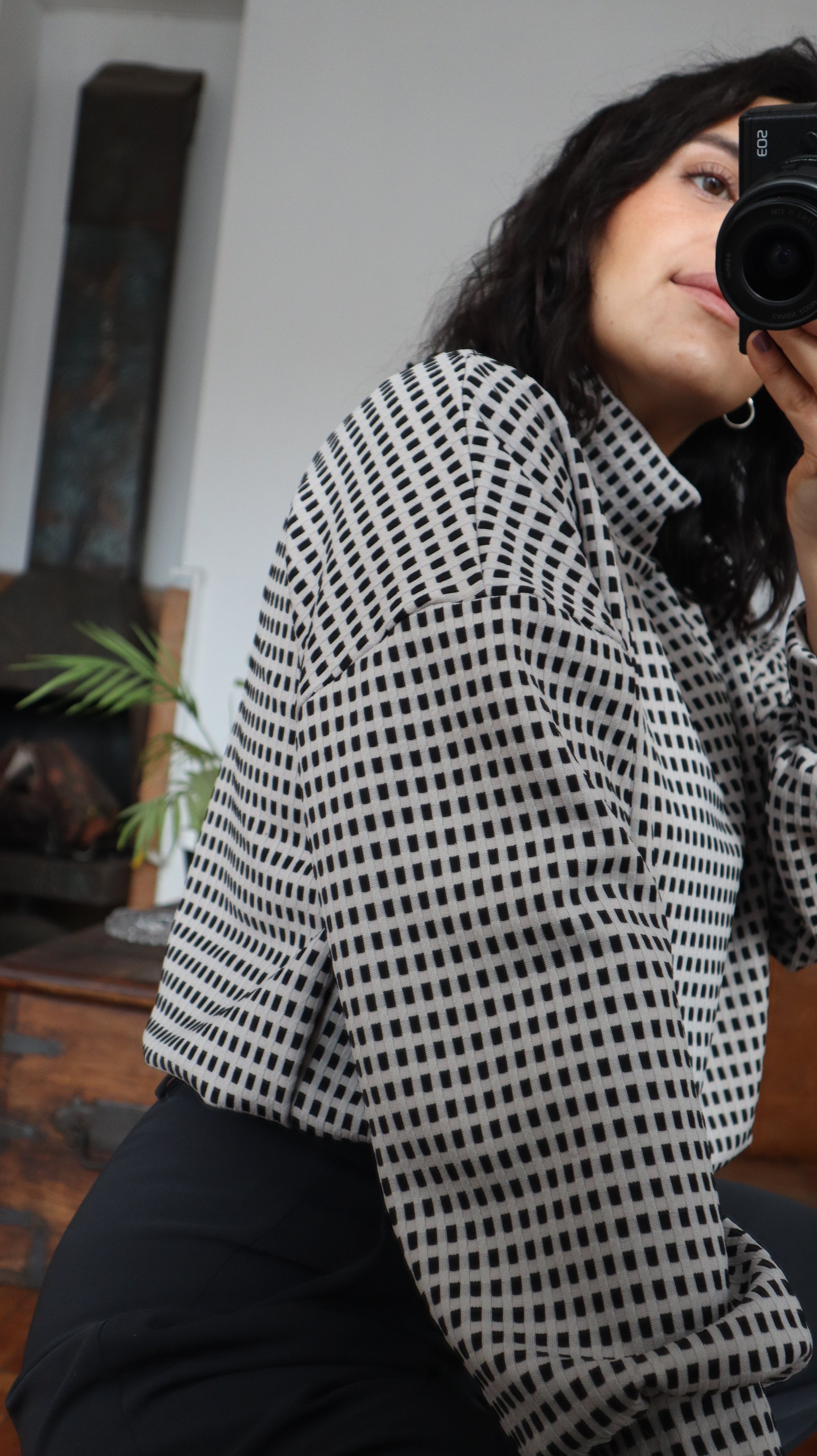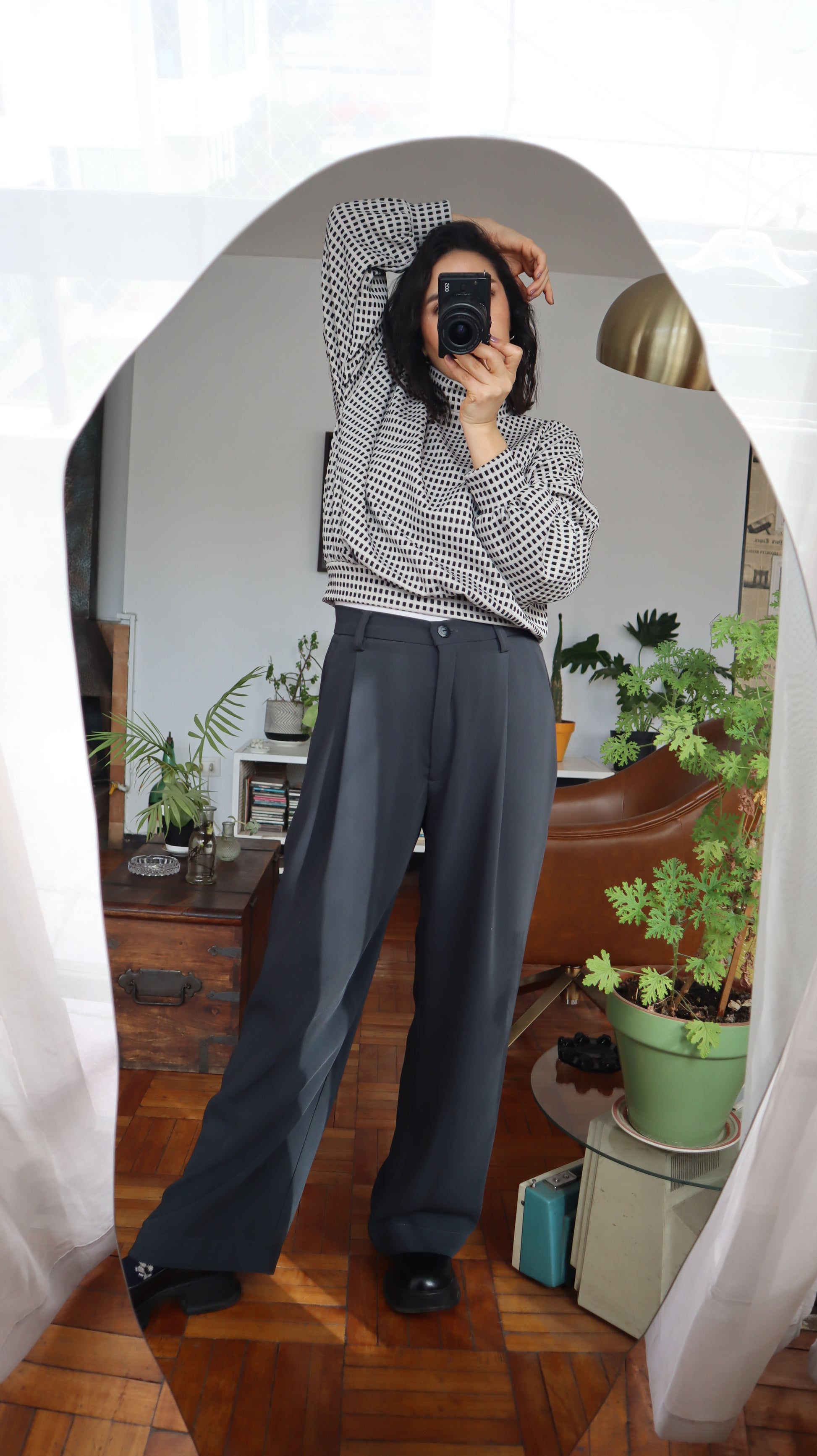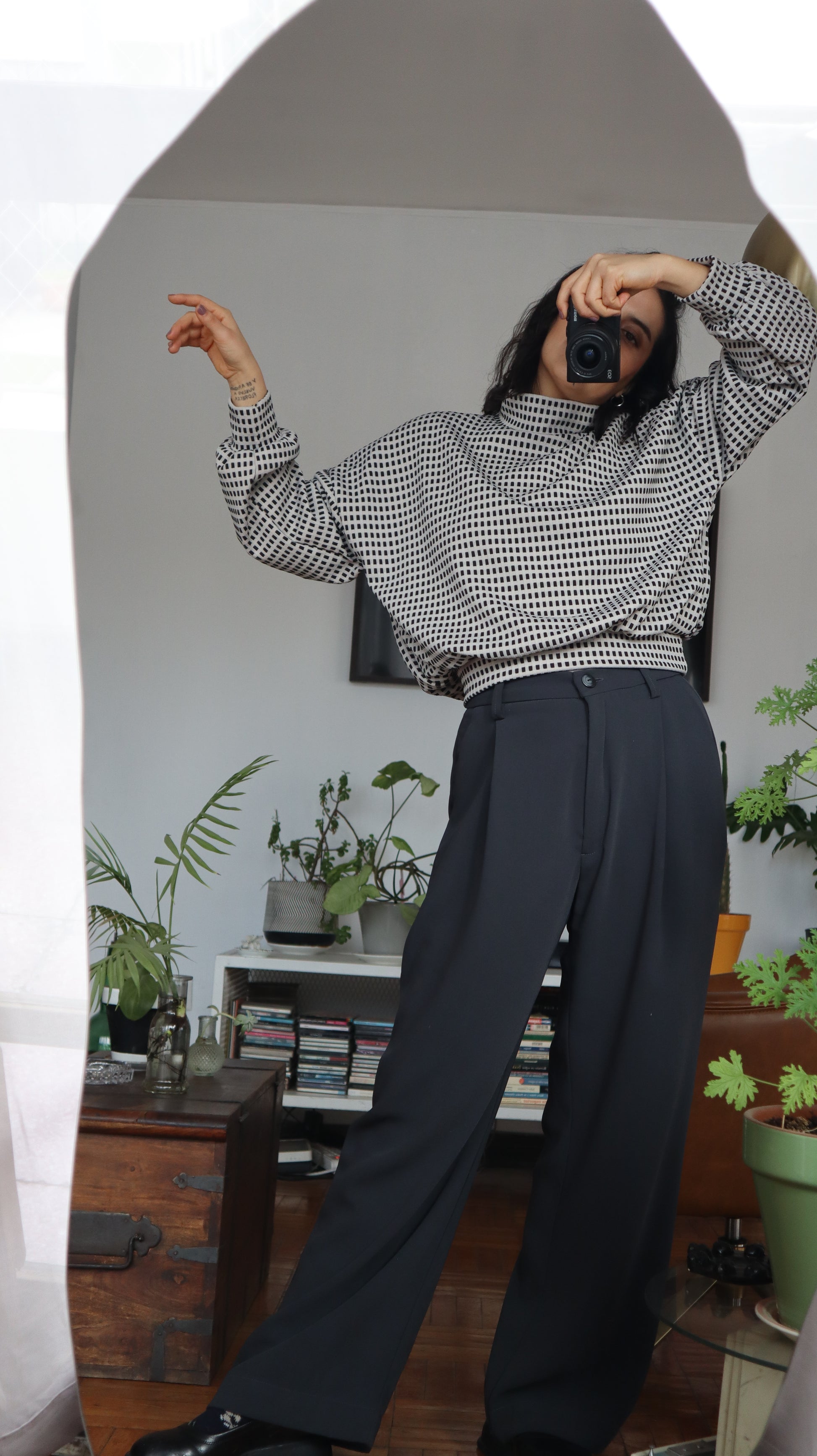 Polerón delgado hecho de tela elasticada, con color gris y negro. Cuenta con cuello, pretina y puños terminados de forma globo. Disponible en talla SM y ML.
