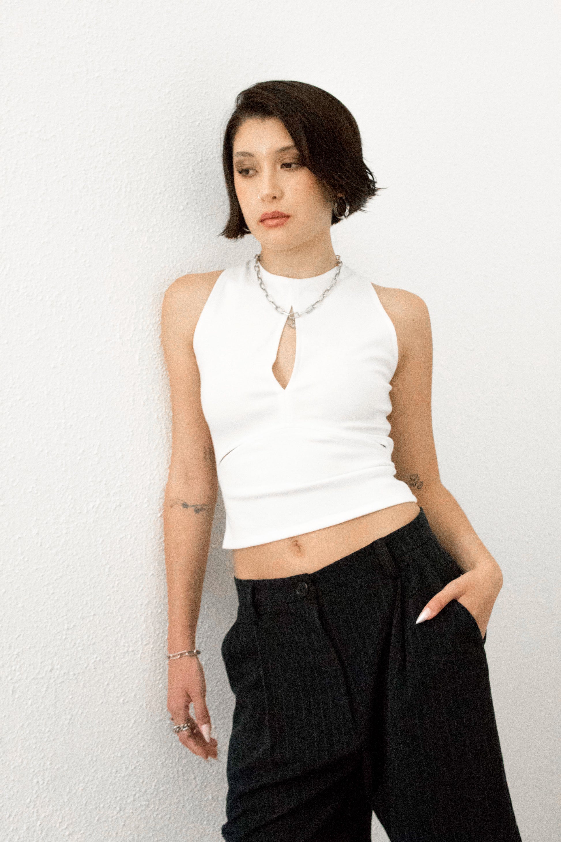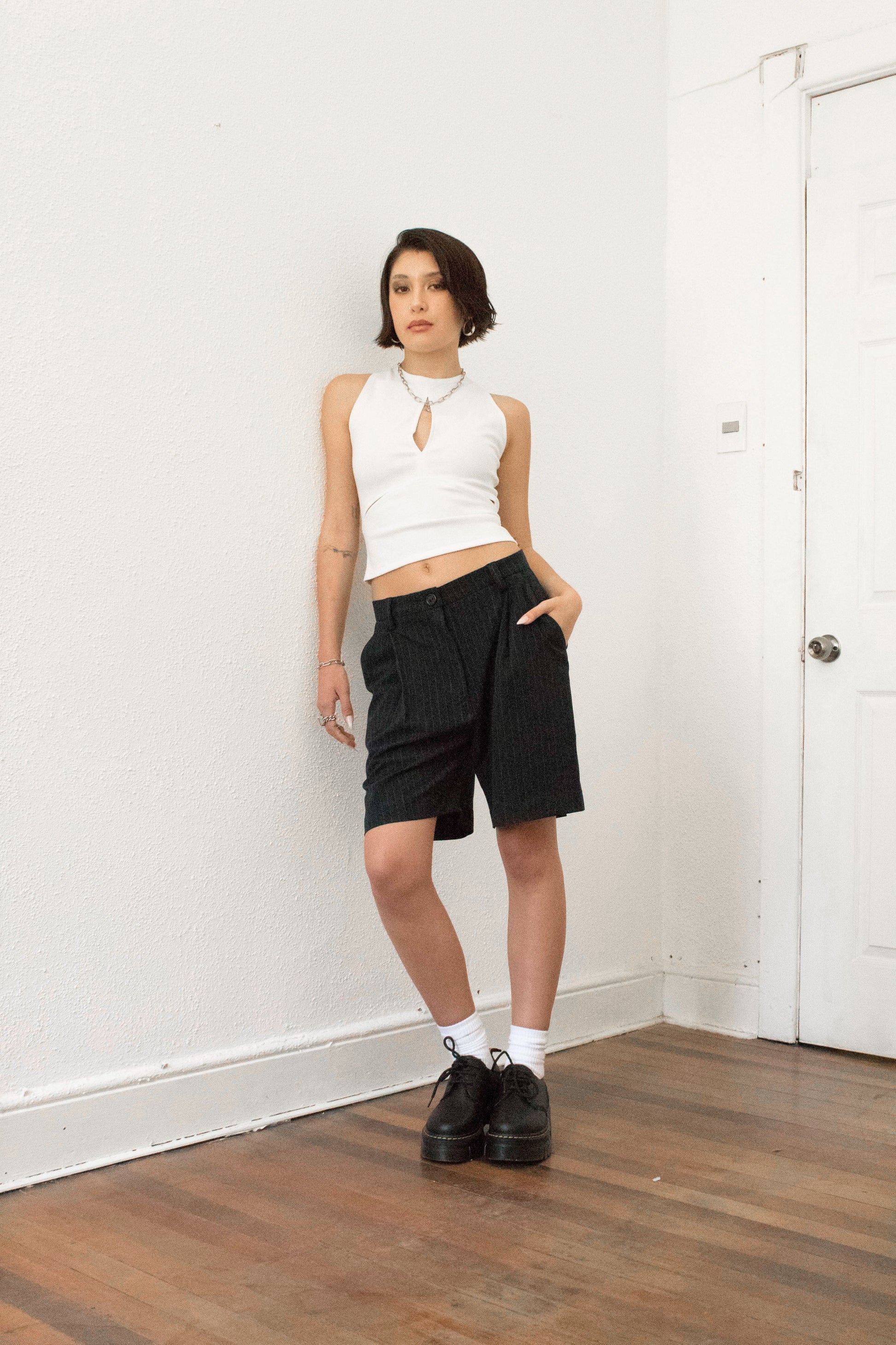 Short de sastre con pinza delantera y en espalda. Cuenta con bolsillos y llega hasta la rodilla.